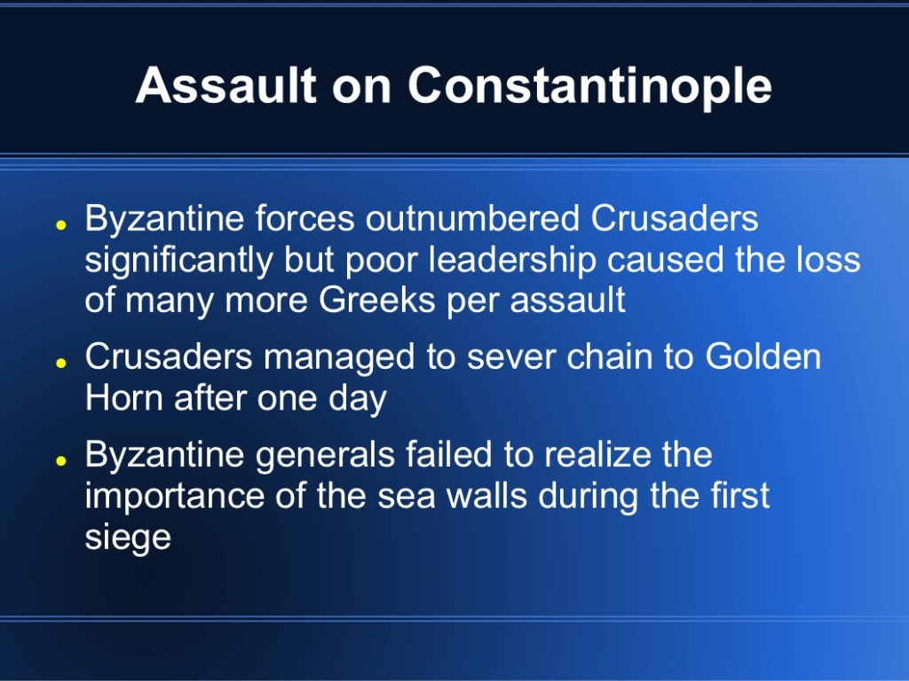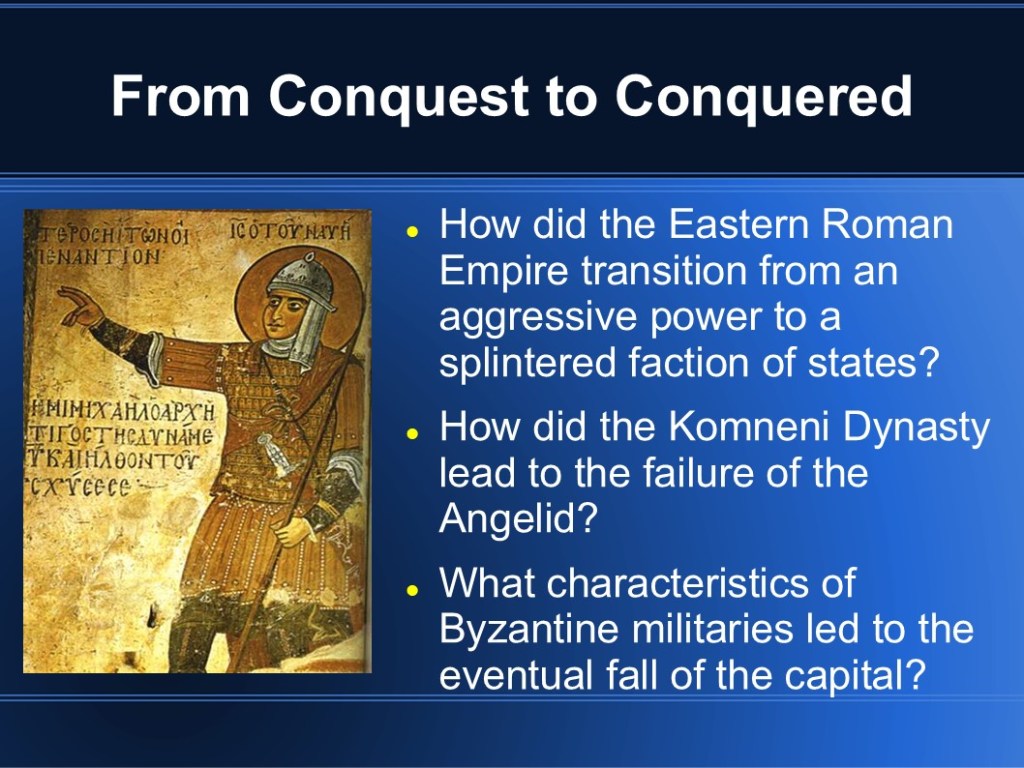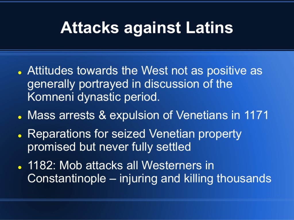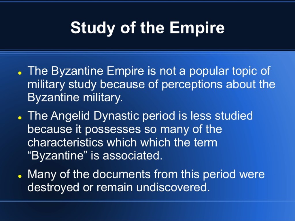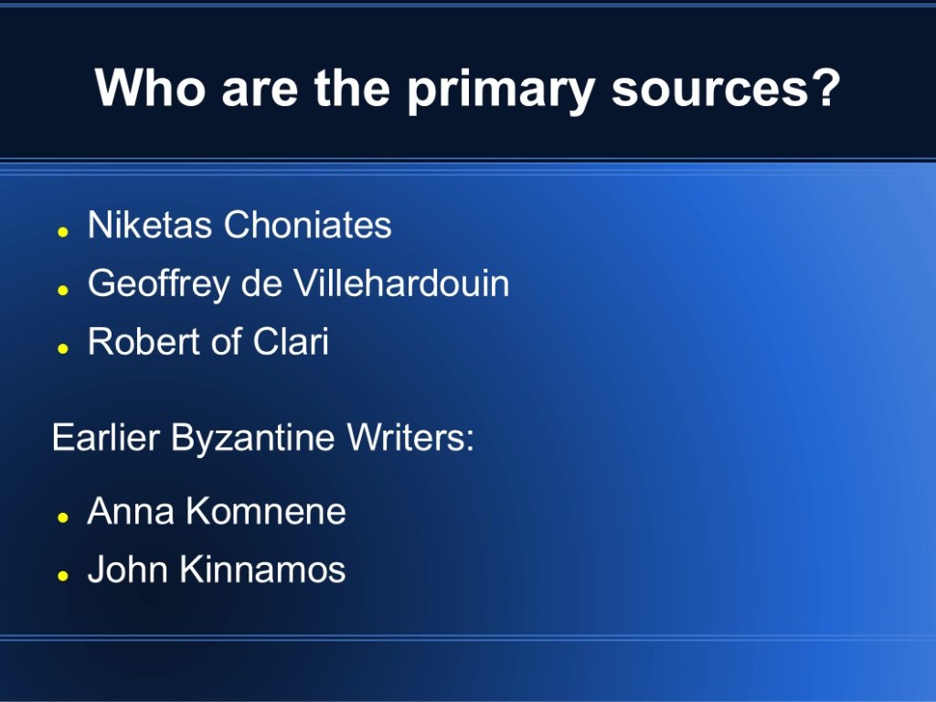 In 2009, I finished my MMA in Military History. My capstone project focused on medieval Byzantium and the Fourth Crusade. While I’m sure it’s out of date so many years later, I’m sharing the original presentation in the event that it may be of interest to someone. (Though I warn you, it was so long ago that my knowledge has faded.)