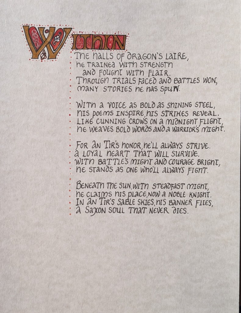 This poem was for Angharat verch Reynulf’s pelican elevation. I knew that I wanted to use a dragon in the pelican pose and thought that using the daffodils to represent Blatha an Oir was a nice touch. This was the first time that I have written this much chrysography – something that I learned with both this and the kingdom scroll I created for the same event is that real 23K gold does not photograph as nicely as painted gold. It tends to catch reflections at odd angles. But it’s shiny in person and that’s what matters.