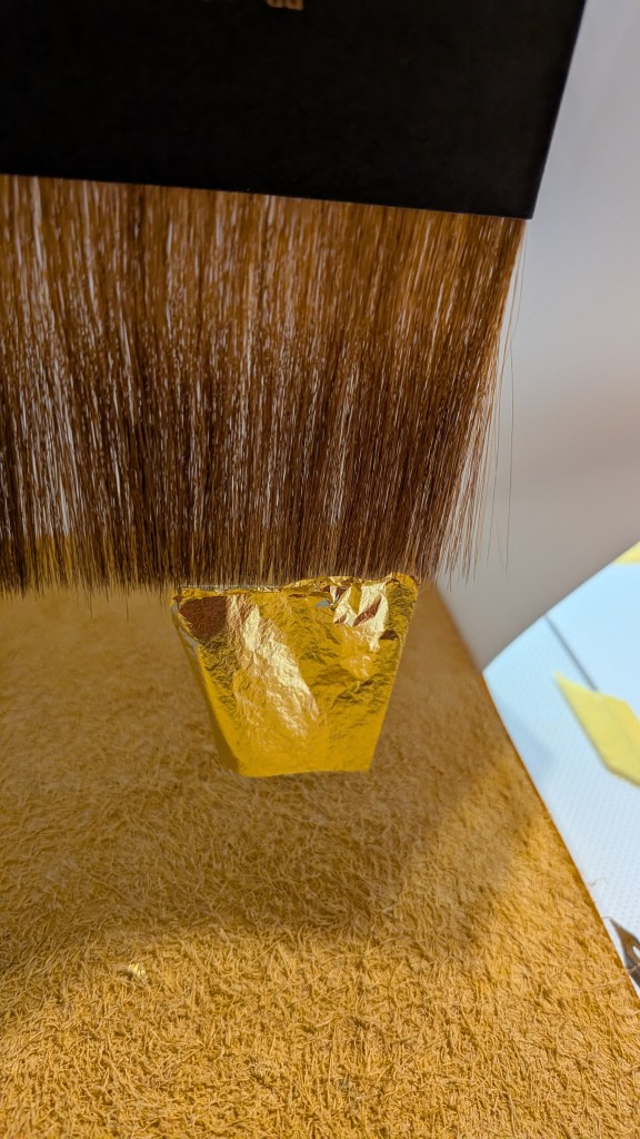 The leaf I was using is very thin (as is typical unless using a double leaf and even then, it’s still thin). I wanted to minimize the amount of touching the actual leaf and also the amount of gold loss, so I did use a gilder’s tip and cushion to apply this.