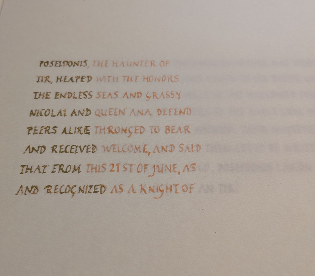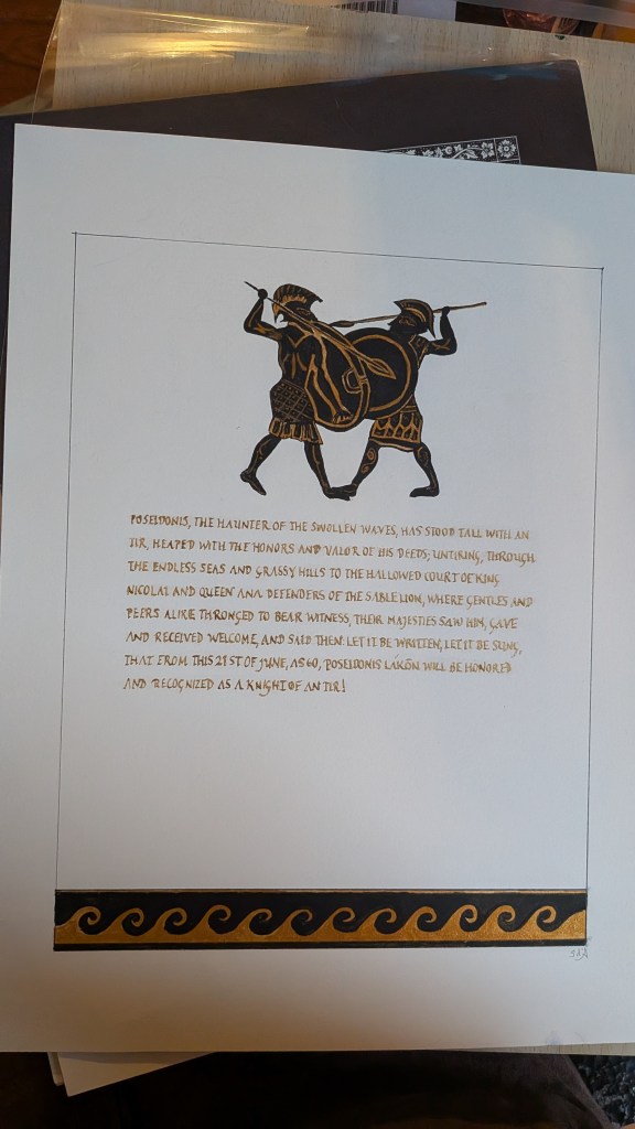 Now that it’s been awarded at June Faire, I can write about my first-ever kingdom scroll. This was a knighthood scroll awarded to Poseidonis Lakon.