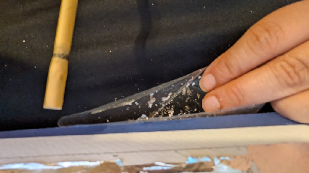 Plus, I really wanted to use silver and see how the texture of a hot press watercolor paper I had would impact the gilding. (I was hoping that it would provide some ridging – it did.) Below is a picture of me warming up glair with a paper straw so I can place more silver down. This is where I learned it is impossible to try and take a photo of yourself doing this and not end up looking like a starry sky.