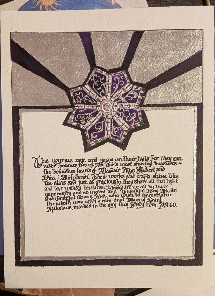 This was a Main de St. Nicolas awarded to their Excellencies Alasdair and Disa at July Coronation 2025. The words weren’t available when I was assigned the scroll and due to the time available for paint/calligraphy/etc, I decided to brave it and do the design and gilding, then add the words, and hope that everything worked out.